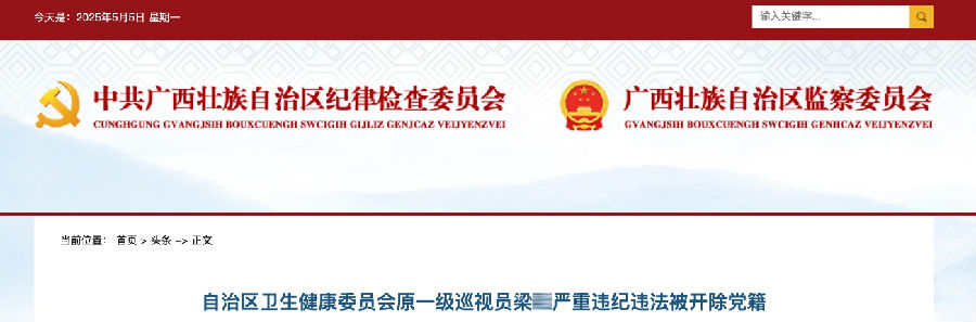 近日,廣西自治區(qū)紀(jì)檢委發(fā)布通報(bào),廣西自治區(qū)衛(wèi)健委原一級(jí)巡視員梁某嚴(yán)重違紀(jì)違法被開(kāi)除黨籍。