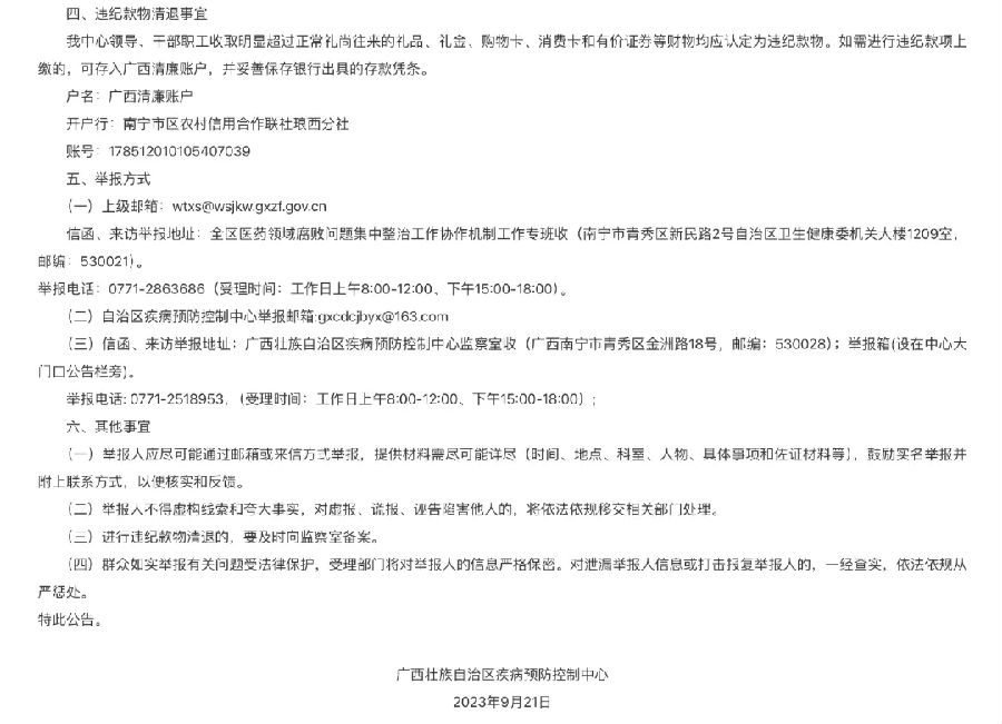 2023年,廣西自治區(qū)疾控中心在展開(kāi)醫(yī)藥領(lǐng)域腐敗問(wèn)題集中整治工作時(shí)也曾就違紀(jì)款物清退等公開(kāi)了清廉賬戶及舉報(bào)方式,并在公告中明確,單位領(lǐng)導(dǎo)、干部職工收取明顯超過(guò)正常禮尚往來(lái)的禮品、禮金、購(gòu)物卡、消費(fèi)卡和有價(jià)證券等財(cái)物均應(yīng)認(rèn)定為違紀(jì)款物。