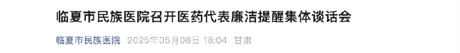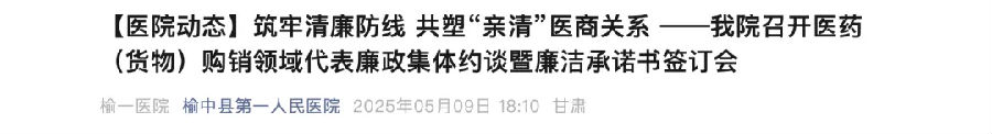 5月9日,甘肅榆中縣第一人民醫(yī)院召開醫(yī)藥(貨物)購銷領(lǐng)域代表廉政集體約談暨廉潔承諾書簽訂會(huì),醫(yī)院重點(diǎn)崗位負(fù)責(zé)人及醫(yī)藥(貨物)購銷領(lǐng)域代表共130人參加會(huì)議;5月8日,甘肅臨夏市民族醫(yī)院召開醫(yī)藥代表廉潔提醒集體談話會(huì),其中30家醫(yī)藥配送企業(yè)代表參加了此次會(huì)議。