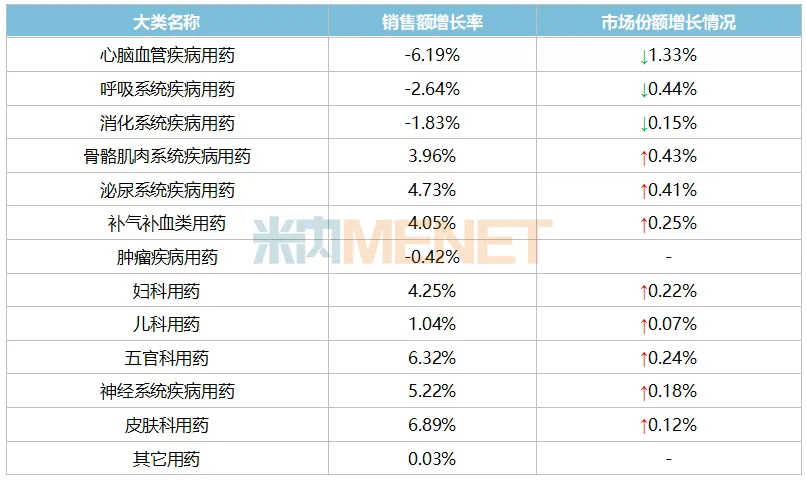 7個(gè)百億大類2024年銷售額有正增長:骨骼肌肉系統(tǒng)疾病用藥增長了3.96%,銷售額超過420億元;泌尿系統(tǒng)疾病用藥增長了4.73%,銷售額接近340億元;補(bǔ)氣補(bǔ)血類用藥、婦科用藥分別增長了4.05%、4.25%,銷售額均在200億元以上;兒科用藥、五官科用藥、神經(jīng)系統(tǒng)疾病用藥分別增長了1.04%、6.32%、5.22%,銷售額均在100億元以上。