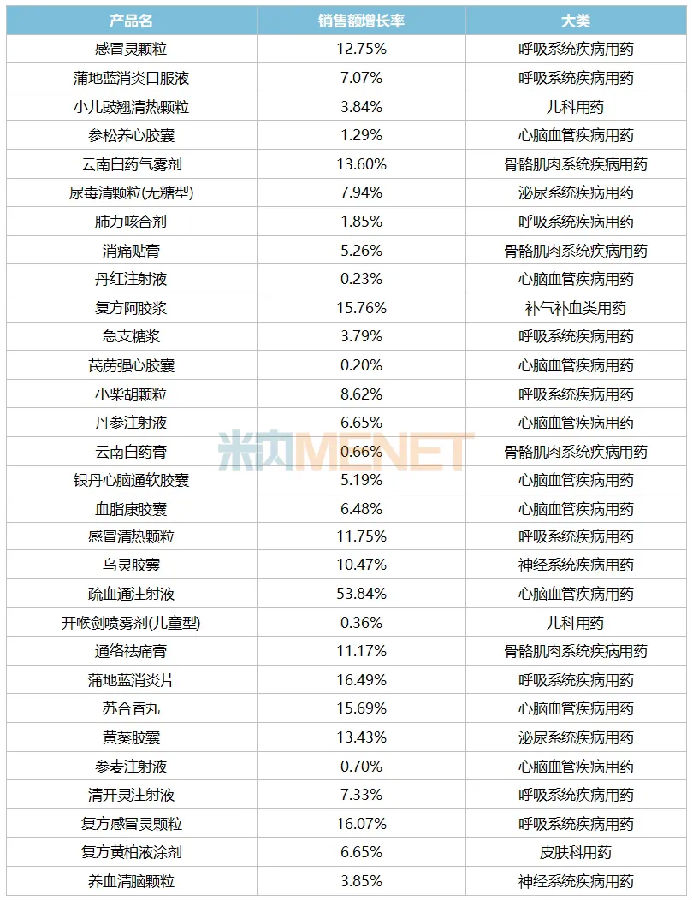 2024年有34個(gè)銷售額超過10億元的中成藥有正增長,其中云南白藥氣霧劑(云南白藥)增長了13.60%,銷售額超過24億元;復(fù)方阿膠漿(東阿阿膠)增長了15.76%,銷售額接近20億元;烏靈膠囊(佐力藥業(yè))增長了10.47%,銷售額超過13億元;疏血通注射液(九芝堂)增長了53.84%,銷售額超過13億元;通絡(luò)祛痛膏(羚銳制藥)增長了11.17%,銷售額超過12億元。