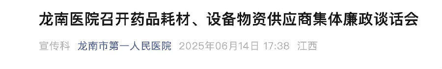 6月14日,江西省龍南市第一人民醫(yī)院召開藥品耗材、設(shè)備物資供應(yīng)商集體廉政談話會(huì),其中有96家藥品耗材、設(shè)備物資供應(yīng)商參會(huì)。