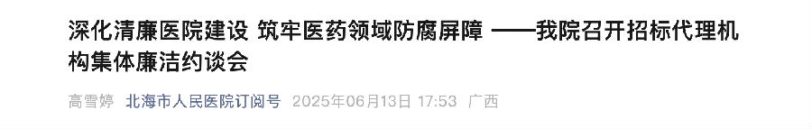 6月13日,廣西北海市人民醫(yī)院召開招標(biāo)代理機(jī)構(gòu)集體廉潔約談會(huì),黨委副書記等相關(guān)職能部門負(fù)責(zé)人及十余家招標(biāo)代理機(jī)構(gòu)代表共27人參加會(huì)議。院黨委書記李曲對(duì)招標(biāo)代理機(jī)構(gòu)代表提出廉潔要求。她指出:“當(dāng)前,醫(yī)藥領(lǐng)域腐敗問(wèn)題專項(xiàng)整治工作正在持續(xù)推進(jìn),我們醫(yī)院也將強(qiáng)化全流程監(jiān)督,對(duì)違規(guī)行為采取‘零容忍’的態(tài)度。”