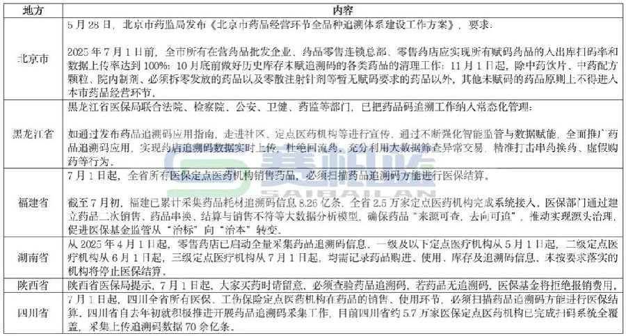 據(jù)賽柏藍(lán)不完全統(tǒng)計(jì),自國(guó)家發(fā)布《關(guān)于加強(qiáng)藥品追溯碼在醫(yī)療保障和工傷保險(xiǎn)領(lǐng)域采集應(yīng)用的通知》后,該項(xiàng)工作在各地已積極有效落實(shí):