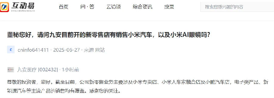 01 九安醫(yī)療跨界賣小米汽車 并非沖動決定 7月7日,九安醫(yī)療在互動平臺回答投資者提問時表示,公司新零售業(yè)務(wù)主要涉及小米專賣店、小米人車家融合店及小鵬汽車店,電子類產(chǎn)品、新能源汽車等主流產(chǎn)品的銷售均有覆蓋。 一個醫(yī)療器械公司去賣新能源汽車,如此布局難免被認為有“不務(wù)正業(yè)”之嫌。針對投資者關(guān)于“是不是不看好醫(yī)療相關(guān)業(yè)務(wù)的發(fā)展”的提問,九安醫(yī)療回應(yīng)稱,持續(xù)看好家用醫(yī)療器械市場的長期未來前景,以及市場需求的穩(wěn)定性。 據(jù)悉,新零售業(yè)務(wù)板塊是九安醫(yī)療一個相對獨立的業(yè)務(wù)單元,由部門自主獨立決策,截至2024年末占營業(yè)收入比重為2.43%。 九安開賣新能源汽車并非臨時上馬的“蹭熱度”。早在2022年,九安醫(yī)療就接連購入了小鵬汽車、理想汽車和蔚來汽車的股票,合計投入資金約3.5億元。據(jù)2024年中報顯示,九安醫(yī)療又增加了特斯拉的投資。 近些年,為拓展新零售業(yè)務(wù)渠道,九安醫(yī)療又新設(shè)電子科技公司、汽車銷售服務(wù)有限公司等主體。換言之,在汽車銷售領(lǐng)域,九安醫(yī)療不是新秀,而是有深厚資本背景和完整銷售網(wǎng)絡(luò)的老兵。 02 10年合作 小米與九安和平分手 九安與小米的合作更是由來已久。 2014年,小米2500萬美元入股九安醫(yī)療iHealth,持股共計20%。依托小米“線下+線上”的新零售體系,彼時外貿(mào)見長的九安醫(yī)療,在2016-2017年實現(xiàn)了iHealth產(chǎn)品國內(nèi)收入占比快速躍升。 但隨著九安醫(yī)療業(yè)務(wù)重心轉(zhuǎn)移,以及小米健康生態(tài)自建能力增強,雙方的協(xié)同需求開始逐步下降。