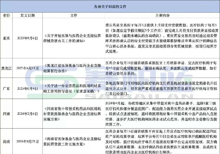 集采藥品耗材、國談藥回款難問題,全部破解時間將至。 01 醫(yī)保直接結算推進提速 集采內回款效率迎來突破 根據國家醫(yī)保局要求,2025年全國基本實現集采藥品耗材、國談藥的直接結算,2026年全國全面實現集采藥品耗材、國談藥的直接結算。 當前已進入8月末,距離 “全國全面實現集采藥品耗材、國談藥直接結算” 的最終目標時限已進入關鍵沖刺階段,各項配套工作推進節(jié)奏明顯加快。 近日,2025年全國醫(yī)療保障工作年中座談會在陜西召開,會議要求,逐步擴大醫(yī)?;饘︶t(yī)藥機構即時結算范圍。 從階段性成效來看,截至6月底,全國超90%的統(tǒng)籌地區(qū)實現即時結算,撥付時限壓縮至申報后20個工作日內。與此同時,醫(yī)?;饘︶t(yī)藥集采企業(yè)直接結算推進同樣成效顯著,平均結算周期壓縮至30天以內。 據賽柏藍觀察,截至目前,全國已有多個省份及統(tǒng)籌地區(qū)率先響應國家要求,發(fā)布了針對醫(yī)保與醫(yī)藥企業(yè)直接結算的地方性實施細則或推進方案。 8月27日,重慶市醫(yī)保局發(fā)布《關于開展醫(yī)保與醫(yī)藥企業(yè)直接結算藥械貨款有關工作的通知》的政策解讀,重慶藥品交易所每月1日提供上月待支付貨款數據,醫(yī)療機構于每月5日前完成上月待支付貨款并直接結算數據確認。這一政策自9月15日起執(zhí)行。 8月26日,天津市醫(yī)藥采購中心發(fā)布《關于藥品、醫(yī)用耗材集采中選品種2025年第8期直接結算》的通知,要求醫(yī)保定點醫(yī)藥機構在8月27日-8月30日24:00完成本期待結算明細表網上確認;8月31日—9月3日12:00,經營企業(yè)完成本期待結算明細表網上確認。 從地方反饋的實效來看,不少省份已明確體現出回款速度加快的積極變化。 例如,自5月以來,浙江省藥械采購平臺設置集采品種和國談藥品結算專區(qū),至6月30日,1182家醫(yī)保定點機構完成結算金額近58億元,按時結算率99.90%,其中1136家實現100%按時結算;江蘇鹽城市第一人民醫(yī)院自今年1月以來,開展醫(yī)?;鸺磿r結算改革試點,醫(yī)?;鸾Y算縮短到一個工作日,日均現金流增加200萬元,到目前已累計撥付1.5億元。 不過,行業(yè)反饋呈現明顯差異化特征,集采內藥品回款改善顯著,但集采之外的普通藥品仍陷“回款難、回款慢” 困境。 黑龍江一醫(yī)藥商業(yè)企業(yè)人士向賽柏藍表示,相較于一年前,其手上集采藥品的回款已基本追回,“主要是政策壓力傳導到位,且集采藥品本身貨款規(guī)模相對可控,因此回款速度明顯加快”,但該人士同時指出,集采范圍之外的普通藥品,回款難、回款慢的壓力依然較大,成為當前結算改革尚未完全覆蓋的領域。 02 集采外藥品回款難仍是長期痛點 多因素疊加影響回款周期 事實上,藥品回款難一直是行業(yè)長期存在的核心痛點。從醫(yī)院的資金壓力、醫(yī)保結算的滯后性到流通環(huán)節(jié)的層層墊付以及企業(yè)自身的管理問題多重因素疊加下,回款周期不斷拉長。 集采之外藥品的回款不適用集采的 “統(tǒng)一回款周期”,而是由參與方通過合同約定,醫(yī)院或商業(yè)公司未按合同約定時間付款,藥品入庫數量、破損理賠、發(fā)票問題導致付款金額與約定不符以及藥品配送延遲、質量問題與回款掛鉤等問題均會影響回款進度。