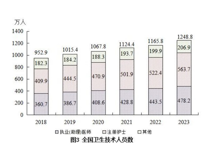 2023 年末,全國(guó)衛(wèi)生人員總數(shù)1523.7 萬(wàn)人,比上年增加 82.7 萬(wàn)人(增長(zhǎng) 5.7%)。