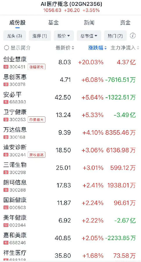 3月10日,AI醫(yī)療概念股迎來大漲。A股方面,塞力醫(yī)療、潤達(dá)醫(yī)療、創(chuàng)業(yè)慧康等封板漲停,思創(chuàng)醫(yī)惠、安必平、衛(wèi)寧健康、迪安診斷、美年健康等漲幅靠前。港股方面,方舟健客、訊飛醫(yī)療、醫(yī)渡科技等也迎來不同程度的上漲。在業(yè)內(nèi)看來,AI醫(yī)療板塊的異?;钴S是受到華為在消息面上的提振。